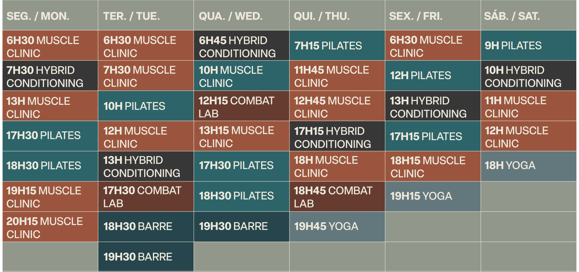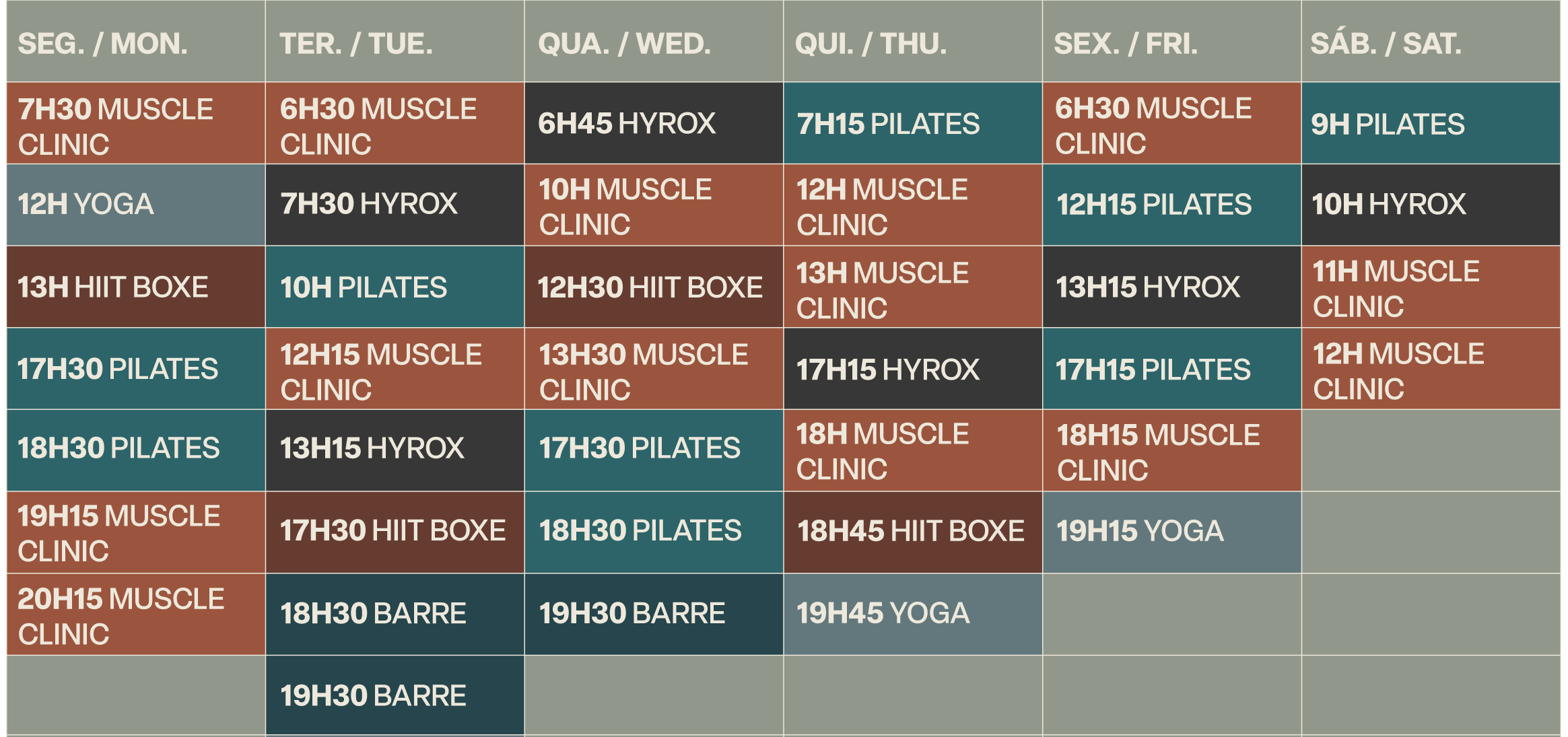 Todas as aulas têm um limite de cinco pessoas e uma duração de 45 minutos. Aulas sujeitas a alterações.